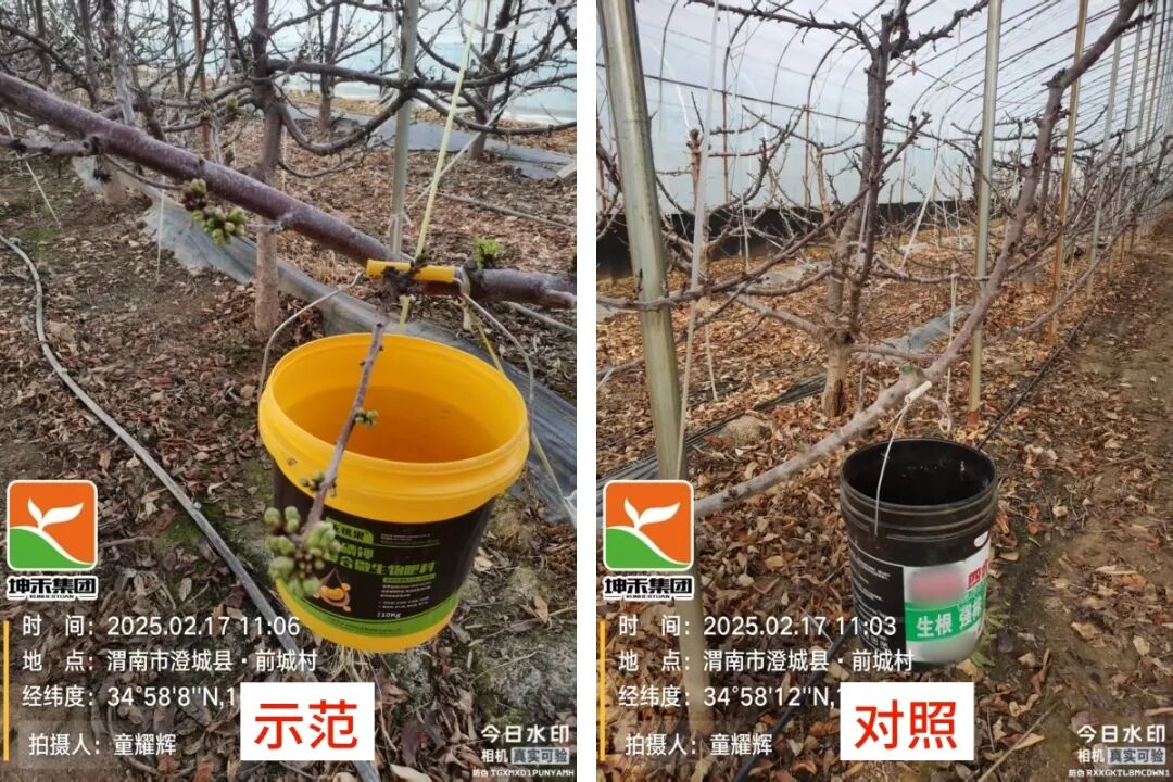 2月17日回訪,“坤禾+”方案試驗棚櫻桃萌芽早,已經(jīng)出現(xiàn)花苞;對照棚剛開始萌芽,無明顯花苞。