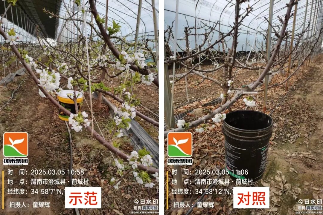 3月5日回訪,“坤禾+”方案試驗棚櫻桃花期早,花量大,花苞大;對照棚陸續(xù)開始開花,花苞小花量小。