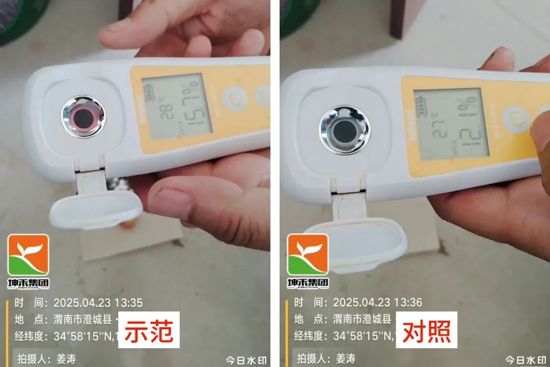 4月23日回訪,進行測糖對比,“坤禾+”方案試驗棚隨機取果測量糖度為15.7;對照棚挑選轉色較好的果子測量糖度為12.1。